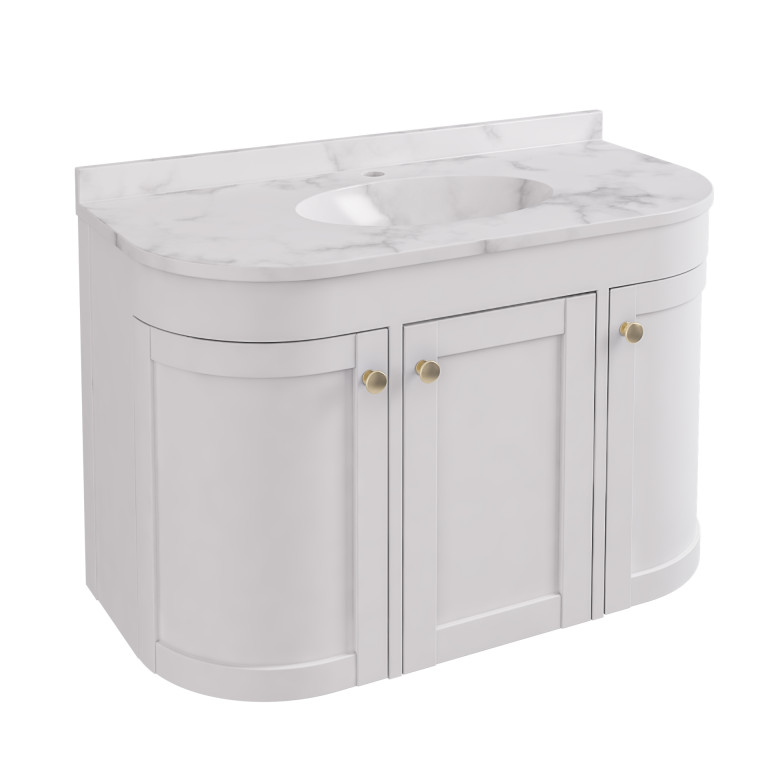 The Hardwick bathroom furniture with the traditionally inspired curved lines and door panels of the vanity unit.