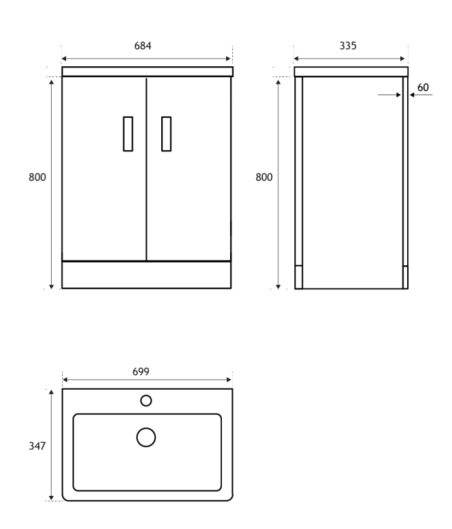 - 335mm (L) x 684mm (W) x 800mm (H)